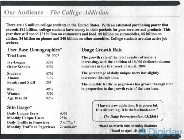 这个指标用在Facebook身上来说一直都令人印象深刻,因为它一直都很高,历史上一直都超过50%。实际上,我一度很好奇这个指标是不是一直都这么好。结果是的!我从2004年的一份Facebook媒体工具包那里发现,即便是在仅有7万用户的时候这个数字也是高得惊人:
