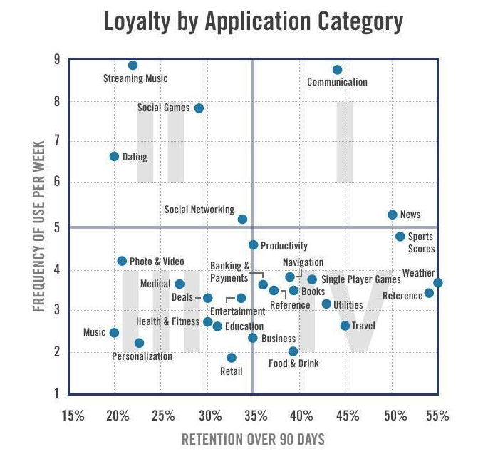 再拓展一下这个想法,你可以认为有着高DAU/MAU的聊天/社交产品其实是极端例子,实际上大多数产品类别都没有那么高的。几年前我分享过下面这张Flurry的图。这张图很有趣,它比较了不同的产品类别极其留存率以及使用频度: